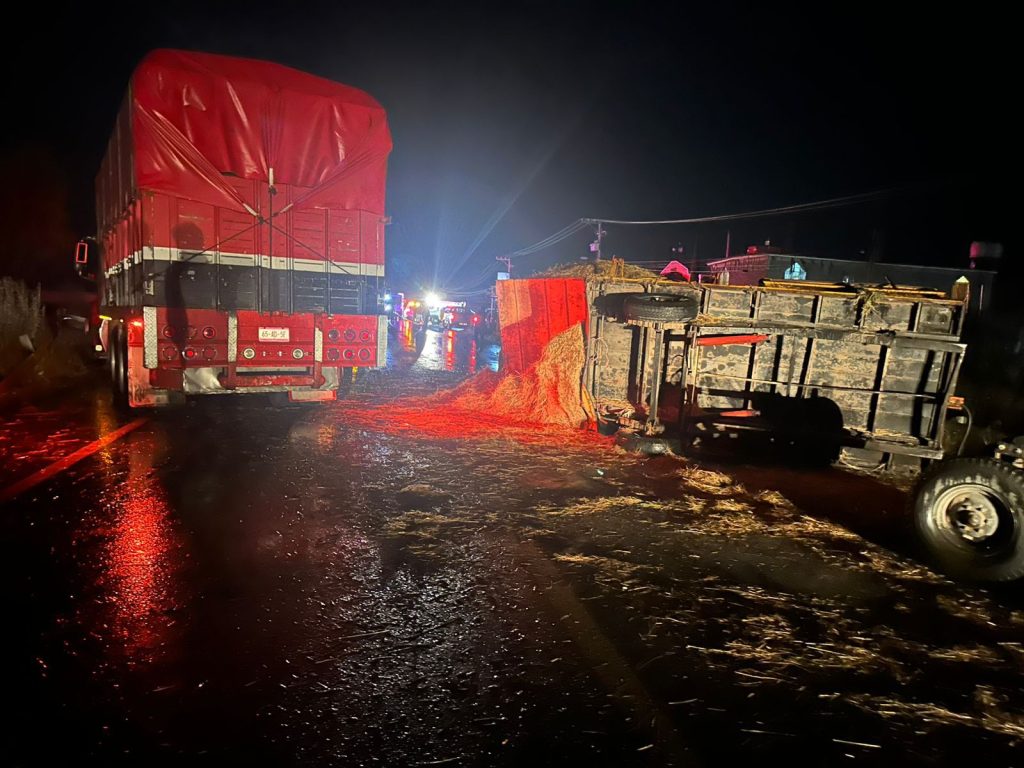Po dicha vialidad transitaba un tractor que jalaba dos remolques con hierba y en determinado momento un Torton International de color rojo con negro intentó rebasar, pero en la acción impactó contra un Renault Kwid de color blanco, esta última unidad terminó destrozada y el remolque volcado