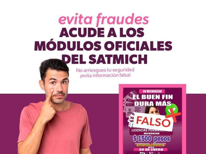 Morelia, Michoacán, 24 de enero de 2026.- Ante el incremento de páginas que en redes sociales ofrecen descuentos y promociones en refrendos, licencias de conducir y diversos trámites vehiculares, la Secretaría de Finanzas y Administración, a través del Servicio de Administración Tributaria de Michoacán (Satmich), alerta a la población para que no se víctima de engaños y fraudes.