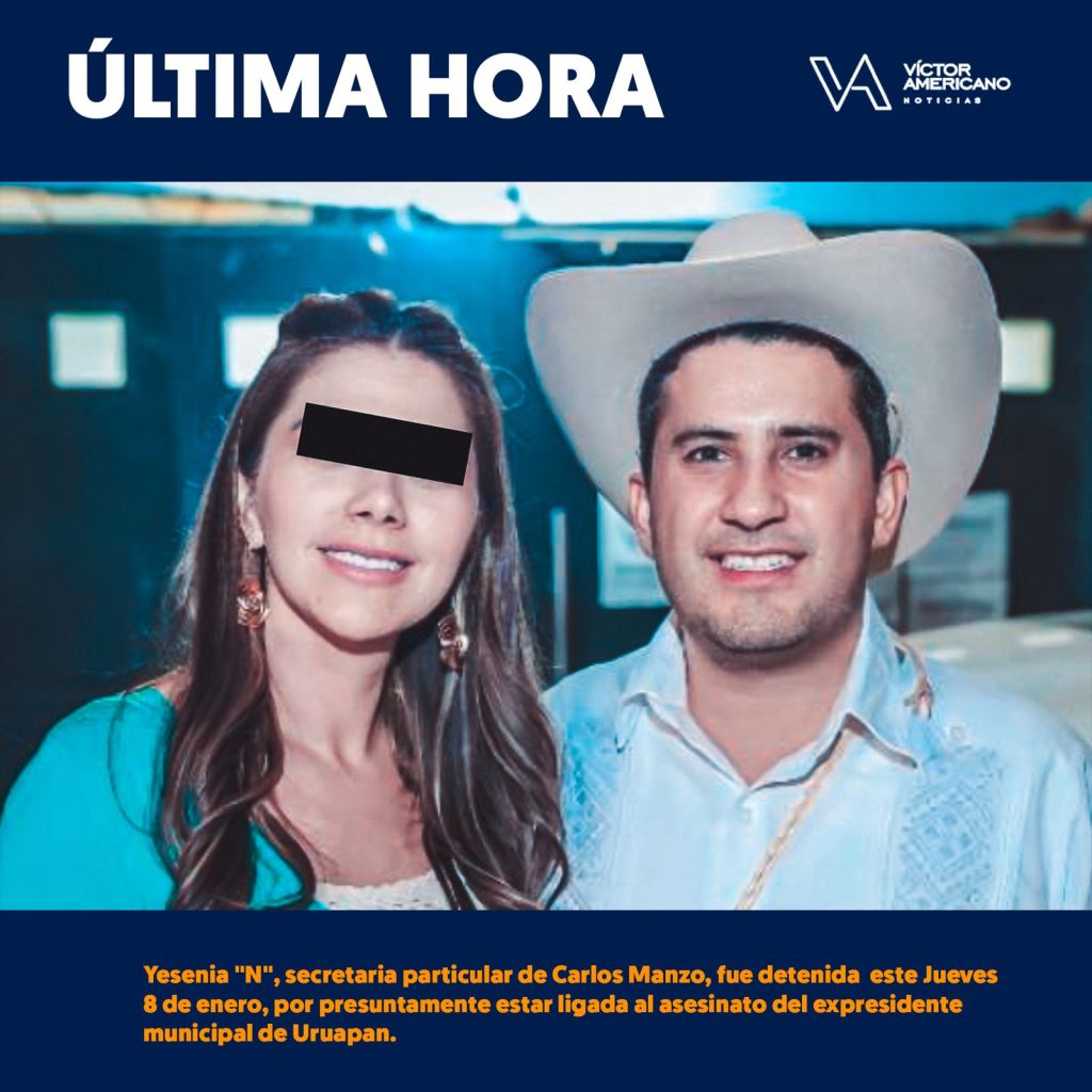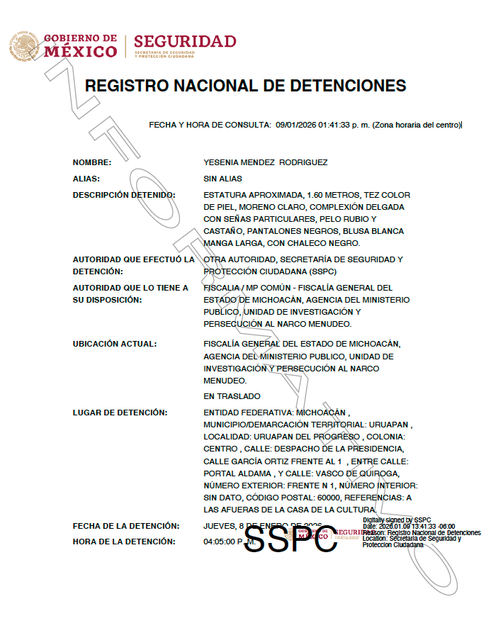 Uruapan, Mich.- Viernes 09 de enero de 2026.- A través del Registro Nacional de Detenciones, difundido por el Gobierno de México y la Secretaría de Seguridad y Protección Ciudadana (SSPC), se dio a conocer la detención de Yesenia Méndez Rodríguez, secretaria particular de Carlos Manzo y Grecia Quiroz. Hasta el momento es una incógnita el motivo de la detención; sin embargo, no se descarta que se pudiera tratar de algún mandamiento judicial o de una comparecencia relacionada con el homicidio de Manzo.