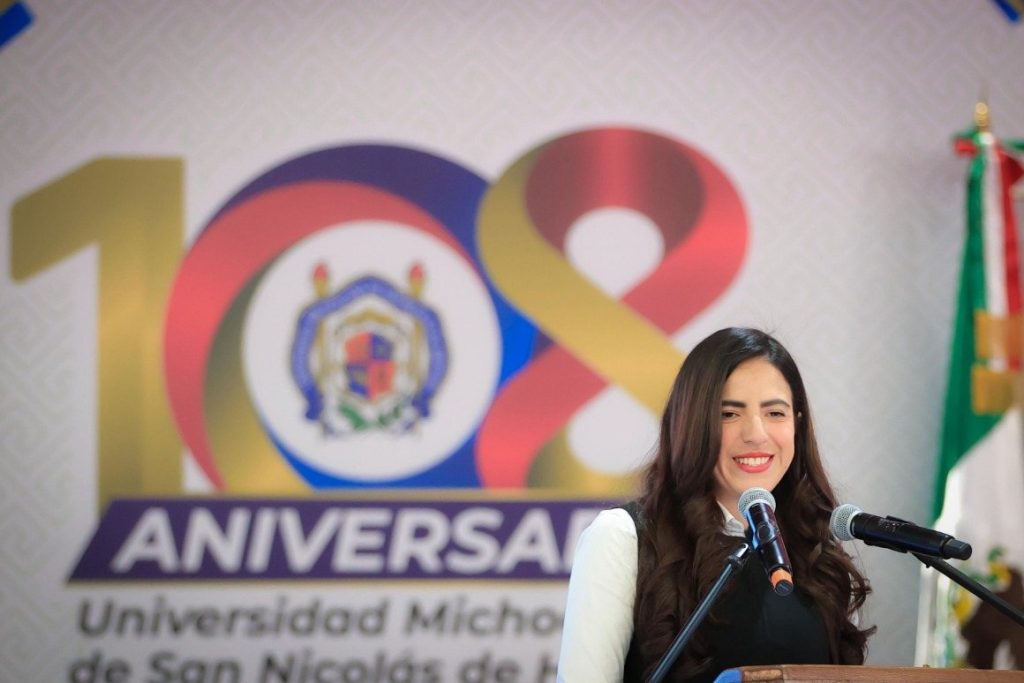 Morelia, Michoacán, a 15 de octubre de 2025.- Durante la conmemoración del 108 aniversario de la Universidad Michoacana de San Nicolás de Hidalgo (UMSNH), realizada en el Teatro Samuel Ramos, la diputada Giulianna Bugarini, presidenta del Congreso del Estado, afirmó que esta Legislatura asumió con valentía y responsabilidad una deuda histórica con la Máxima Casa de Estudios, al aprobar la reforma que garantiza por ley un presupuesto digno, estable y suficiente.