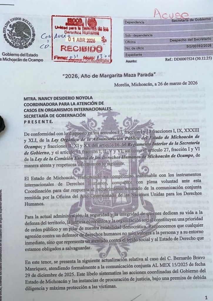 Morelia, Michoacán, 12 de abril de 2026.- El secretario de Gobierno, Raúl Zepeda Villaseñor, informó que el Gobierno del Estado, en coordinación con la Comisión Estatal de los Derechos Humanos (CEDH), ha mantenido una comunicación puntual con la Organización de las Naciones Unidas (ONU), enviando la documentación correspondiente sobre los avances en la investigación por el homicidio del líder limonero Bernardo Bravo Manríquez desde el pasado 1 de abril.