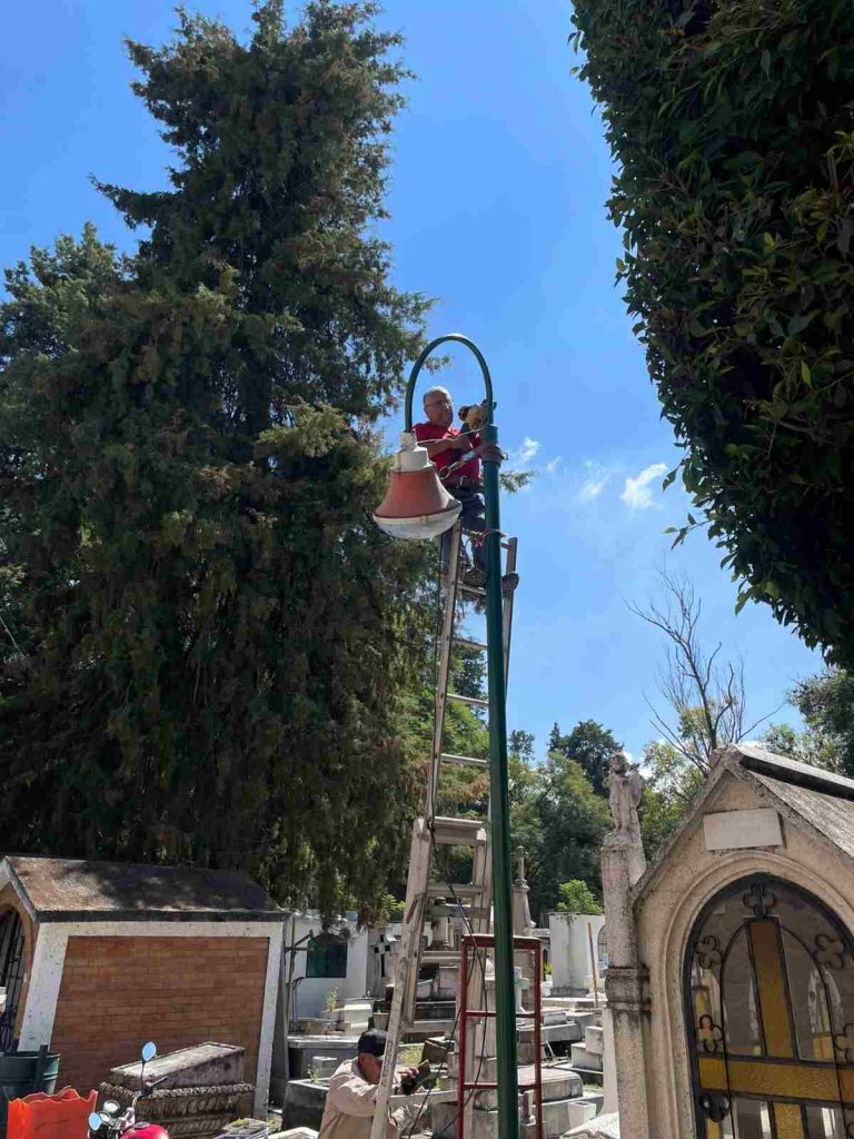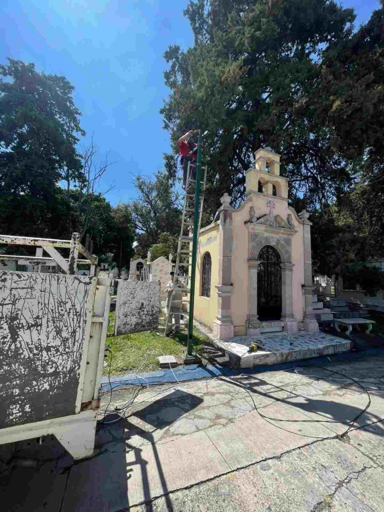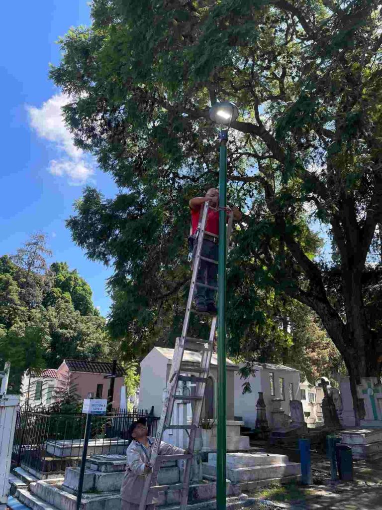 Morelia, Michoacán; 15 de octubre del 2025. — Con el propósito de brindar espacios más seguros, ordenados y con mejor iluminación, el Gobierno de Morelia encabezado por el presidente municipal, Alfonso Martínez Alcázar, realizó labores de mantenimiento y sustitución de 10 lámparas en el andador principal del Panteón Municipal.