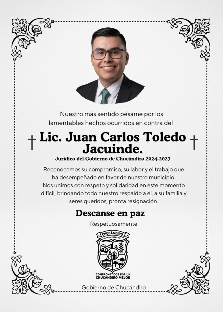 Chucándiro/Morelia, Mich.- Viernes 17 de abril de 2026.- Juan Carlos Toledo Jacuinde, abogado de profesión, maestro y quien se desempeñaba como asesor jurídico del Ayuntamiento de Chucándiro, murió en el Hospital San Miguel, ubicado en la ciudad de Morelia, a consecuencia de las severas lesiones que sufrió tras ser brutalmente golpeado en el citado municipio, informaron autoridades policiales.