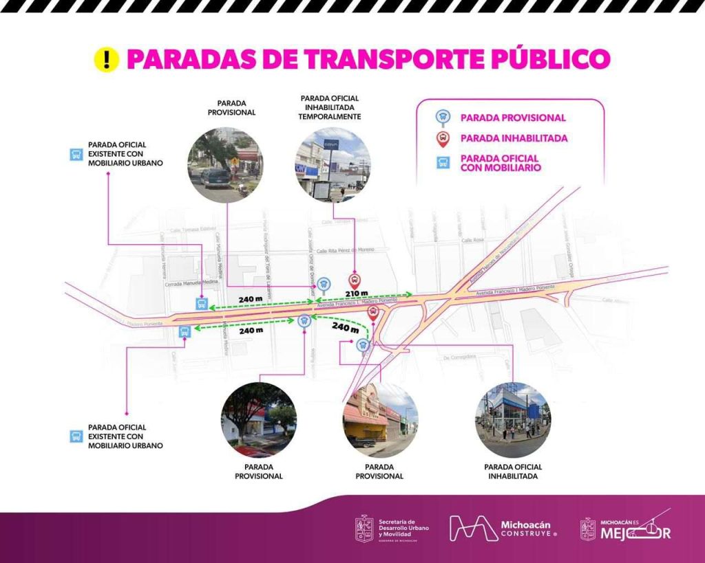 Las paradas de transporte provisionales se establecerán en tres puntos: calzada La Huerta, esquina con Madero, entre las calles Madero y Luis de León Romano; en la zona bancaria de la avenida Madero, en contra esquina con la calle Pedro de Fuentes, y en la esquina con la calle María Rodríguez del Toro de Lazarín.