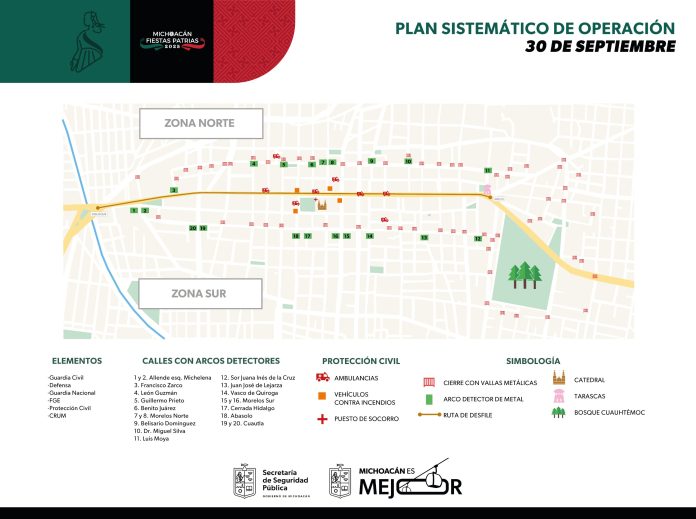 Morelia, Michoacán, 26 de septiembre de 2025.- En el marco del 260 Aniversario del Natalicio de José María Morelos y Pavón, la Secretaría de Seguridad Pública (SSP) establecerá un operativo integral de vigilancia, para garantizar el orden durante el desfile cívico militar del 30 de septiembre, con la habilitación de 20 puntos de acceso para el público que asista.