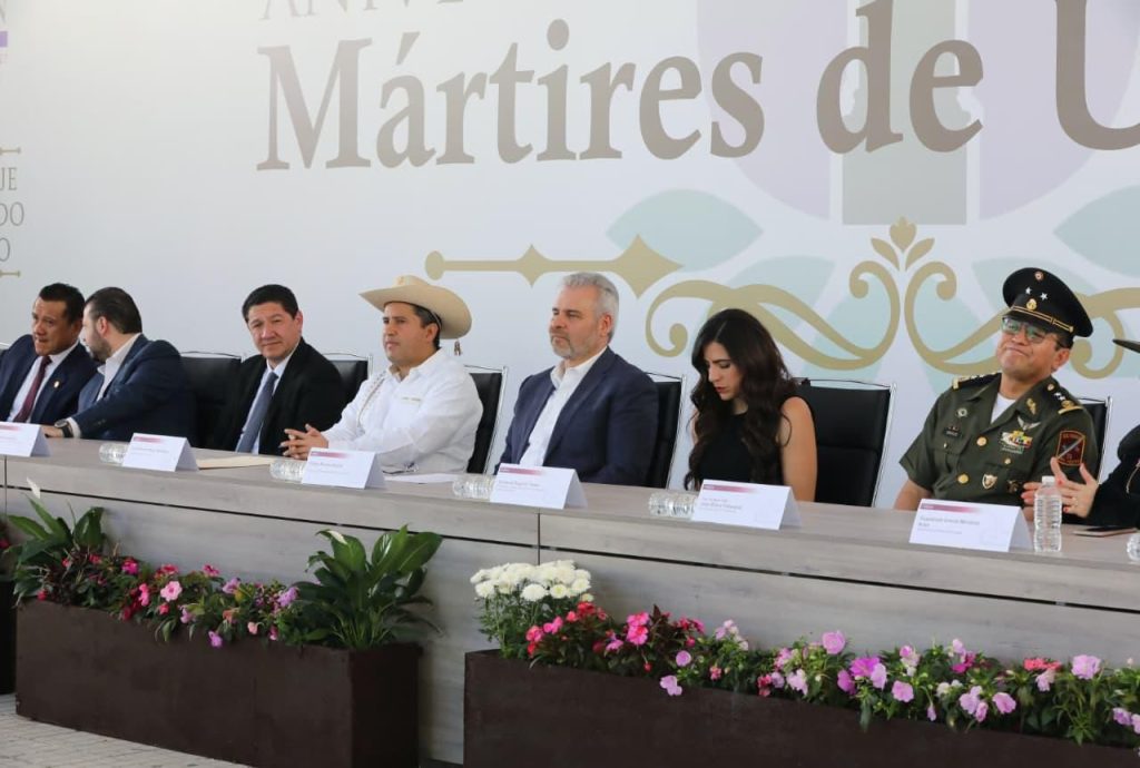 Uruapan, Michoacán, 21 de octubre de 2025.- El gobernador Alfredo Ramírez Bedolla participó en la ceremonia por el 160 Aniversario Luctuoso de los Mártires de Uruapan, con la que se honra la memoria de un grupo de militares fusilados un 21 de octubre de 1865, durante la intervención francesa.