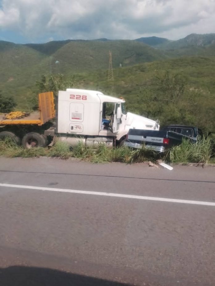 La Unión, Guerrero.- 28 de septiembre de 2025.- La tarde de este domingo, un tráiler con plataforma chocó contra una camioneta en la autopista Siglo XXI. Luego de la colisión las unidades se proyectaron hacía un desnivel, mientras que el remolque acabó obstruyendo la vialidad.