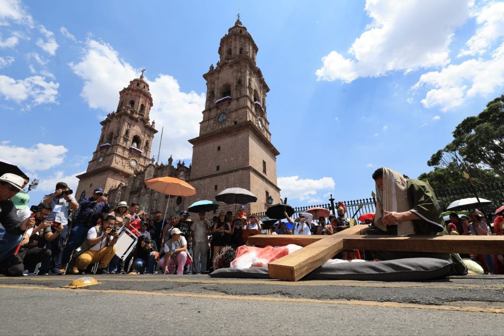 Morelia, Michoacán, 03 de abril de 2026.- En un ambiente de respeto y profunda emoción, el Centro Histórico de Morelia fue escenario de la representación del Juicio, el Viacrucis y la Crucifixión de Jesús, una puesta en escena impulsada por el Gobierno de Alfonso Martínez Alcázar, y que reunió a miles de familias, visitantes y turistas en torno a una de las tradiciones más significativas de la Semana Santa.