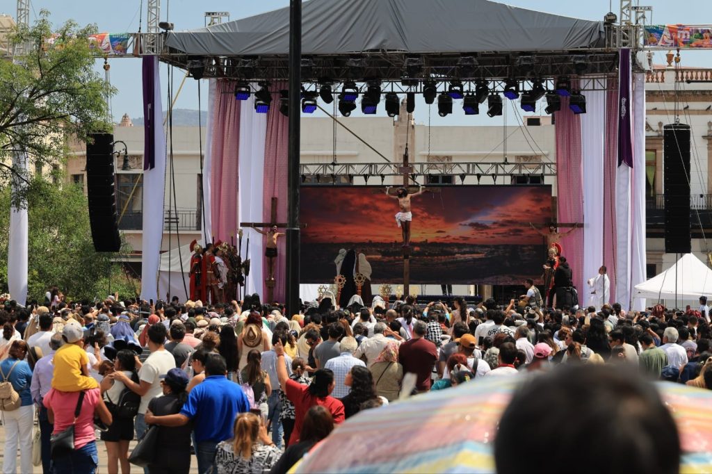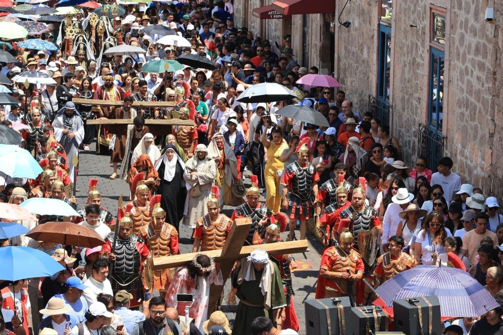 El recorrido del Viacrucis avanzó sobre la Avenida Madero y la calle Melchor Ocampo, llena de espectadores, quienes vivieron cada pasaje con recogimiento y emoción. El público vivió una experiencia más cercana y envolvente, al acompañar a los actores ataviados con vestuario de la época.