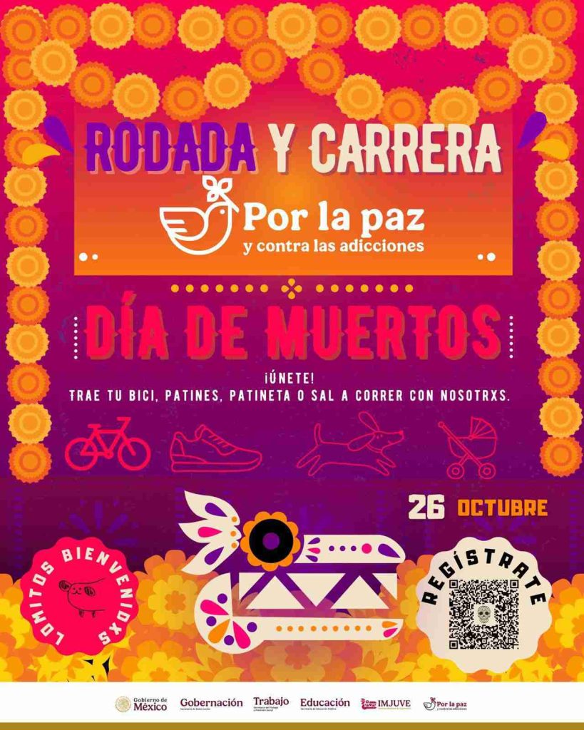 Ciudad de México, 23 de octubre 2025.- El Instituto Mexicano de la Juventud (IMJUVE) invita a las juventudes de todo el país a sumarse a la segunda edición de la Rodada y Carrera por la Paz y Contra las Adicciones, que este año se realizará con una temática especial de Día de Muertos y promete una jornada llena de color, energía y participación comunitaria.