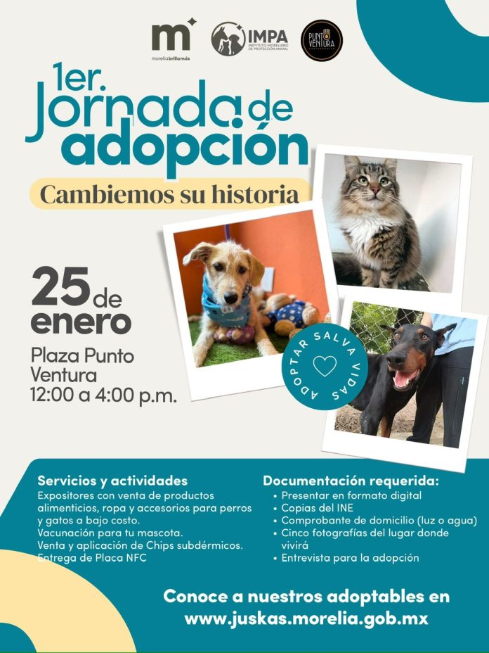 Morelia, Michoacán, a 23 de enero de 2026.- El Gobierno de Morelia, a través del Instituto Municipal de Protección Animal (IMPA), invita a la ciudadanía a participar en la Primera Jornada de Adopción bajo el lema “Cambiemos su historia”, que se llevará a cabo el próximo 25 de enero, en la Plaza Punto Ventura, ubicada en Calzada Ventura Puente 1509, colonia Electricistas, en un horario de 12:00 a 16:00 horas.