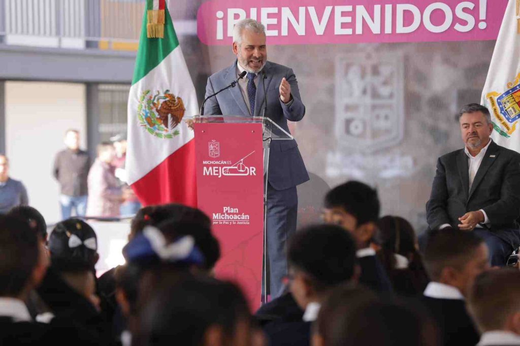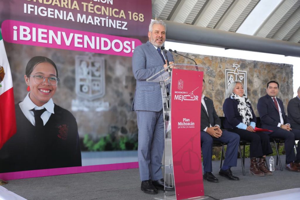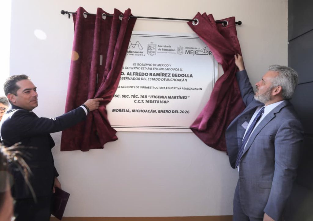 Morelia, Michoacán, 12 de enero de 2026.- Para el impulso y mejora de la educación de más de 800 alumnos de Villas del Pedregal, el gobernador Alfredo Ramírez Bedolla inauguró la Escuela Secundaria Técnica 168 “Ifigenia Martínez”, obra que forma parte del complejo educativo más grande que se construye en Michoacán con recursos estatales.
