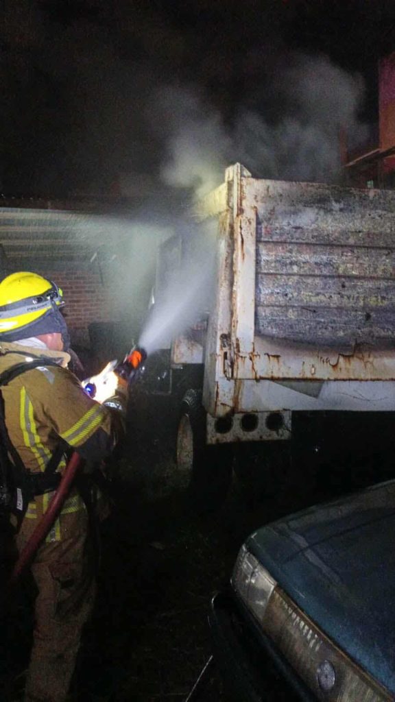 Morelia, Mich.- Martes 27 de enero de 2026.- Un camión volteo se incendió al interior de un taller mecánico y la radiación de las llamas afectó otros cuatro vehículos, hecho ocurrido en la colonia Industrial de la ciudad de Morelia, informaron fuentes de rescate y policiales.