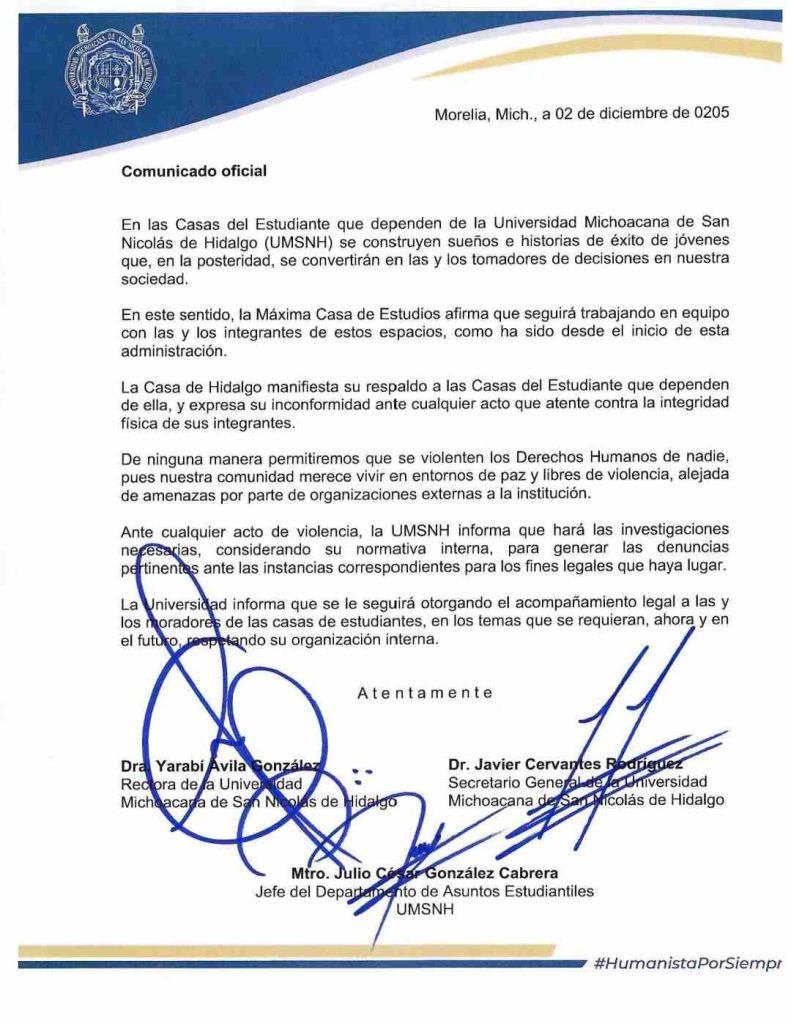 Morelia, Mich.- Martes 02 de diciembre de 2025.- La Casa del Estudiante Nicolaita informó que fue expulsado el morador Inés Axayácatl Jorge Medina, integrante activo del Frente Nacional de Lucha por el Socialismo (FNLS), luego de que fuera sorprendido consumiendo sustancias ilícitas al interior del recinto estudiantil.