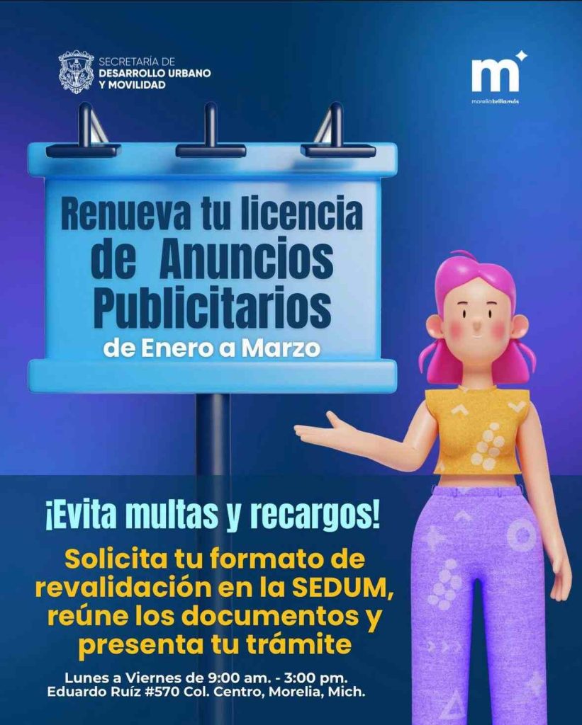 Morelia, Michoacán; 02 de marzo de 2026.- La Secretaría de Desarrollo Urbano y Movilidad (Sedum), recuerda a la ciudadanía que el próximo 31 de marzo vence el plazo para regularizar los anuncios publicitarios correspondientes al ejercicio 2026.