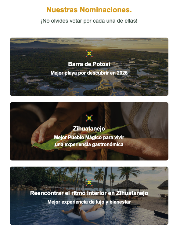 El doble paraíso está nominado en las categorías: “Mejor playa por descubrir en 2026: Barra de Potosí”, “Mejor Pueblo Mágico para vivir una experiencia gastronómica: Zihuatanejo”; y “Mejor experiencia de lujo y bienestar: Reencontrar el ritmo interior en Zihuatanejo”; la votación ya está abierta hasta el día 20 de abril del 2026 a las 23:59 hrs.