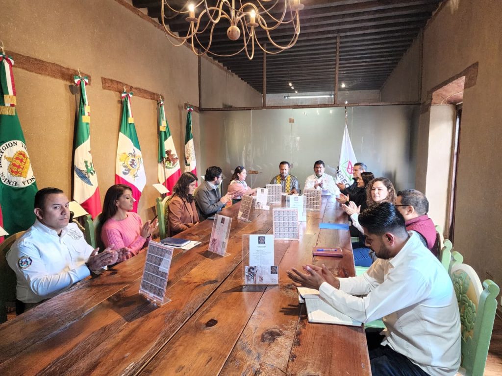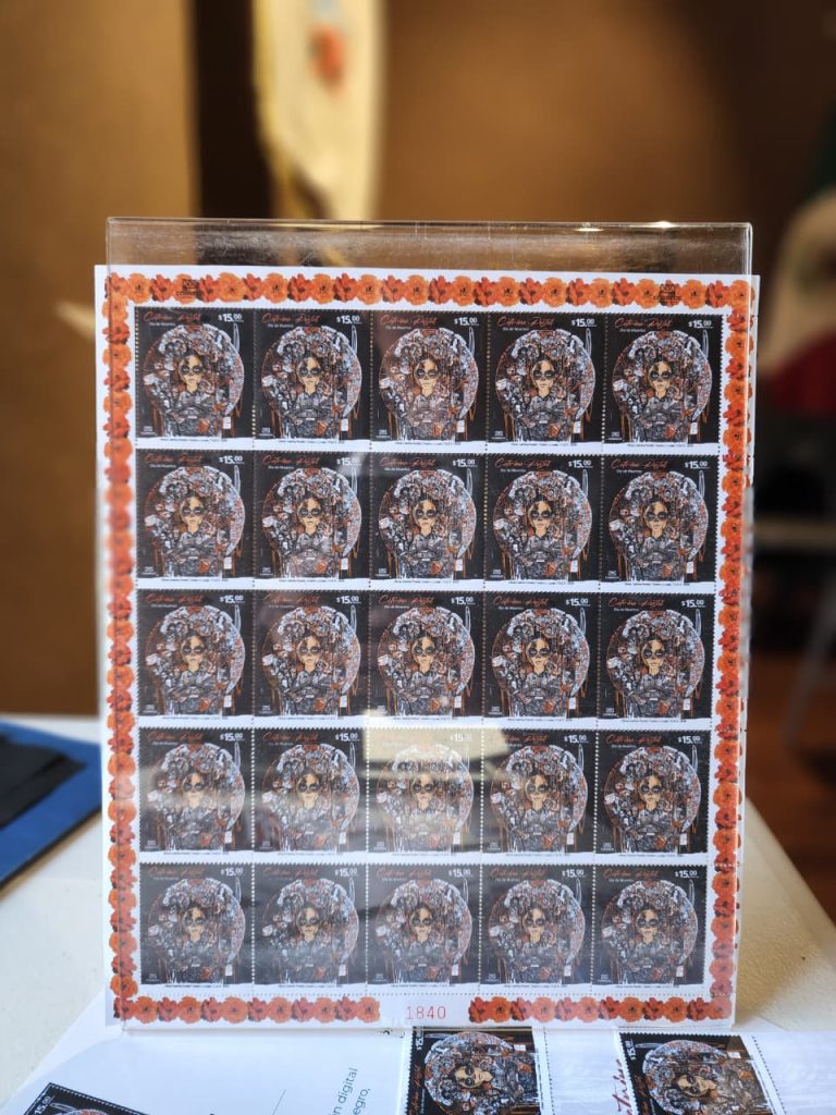 Pátzcuaro, Michoacán, a 10 de diciembre de 2025.- El presidente municipal Julio Arreola encabezó en la Sala de Banderas del Palacio Municipal la ceremonia de réplica de cancelación de la estampilla filatélica Catrina Postal – Día de Muertos, pieza que formará parte del acervo cultural de Correos de México y que viajará a 192 países, llevando al mundo la grandeza de esta tradición.