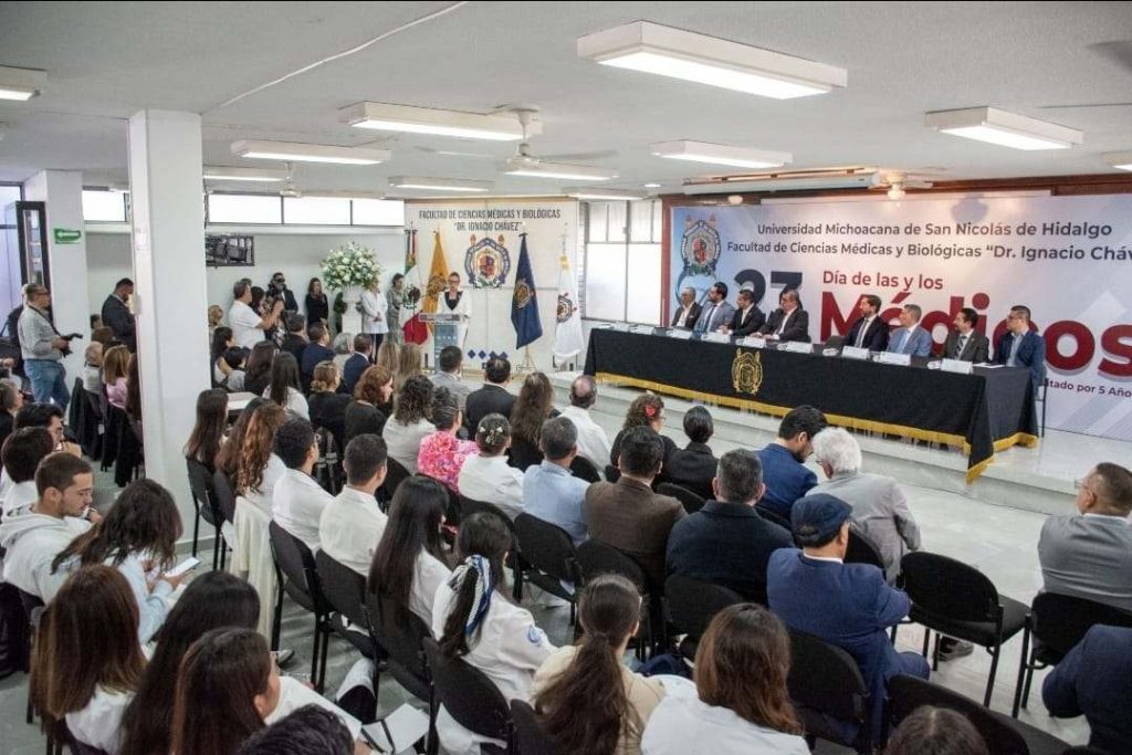 Morelia, Michoacán, a 23 de octubre de 2025.- “En cada médico y en cada médica se conjuga la ciencia, la empatía, la razón, la compasión, la disciplina y la esperanza. La Medicina más que una ciencia, es una forma de humanismo en acción, es el ejercicio más noble del servicio al prójimo y una expresión viva del espíritu nicolaita”, afirmó la rectora de la Universidad Michoacana de San Nicolás de Hidalgo (UMSNH), Yarabí Ávila González, al asistir a la conmemoración del Día de la Médica y el Médico.