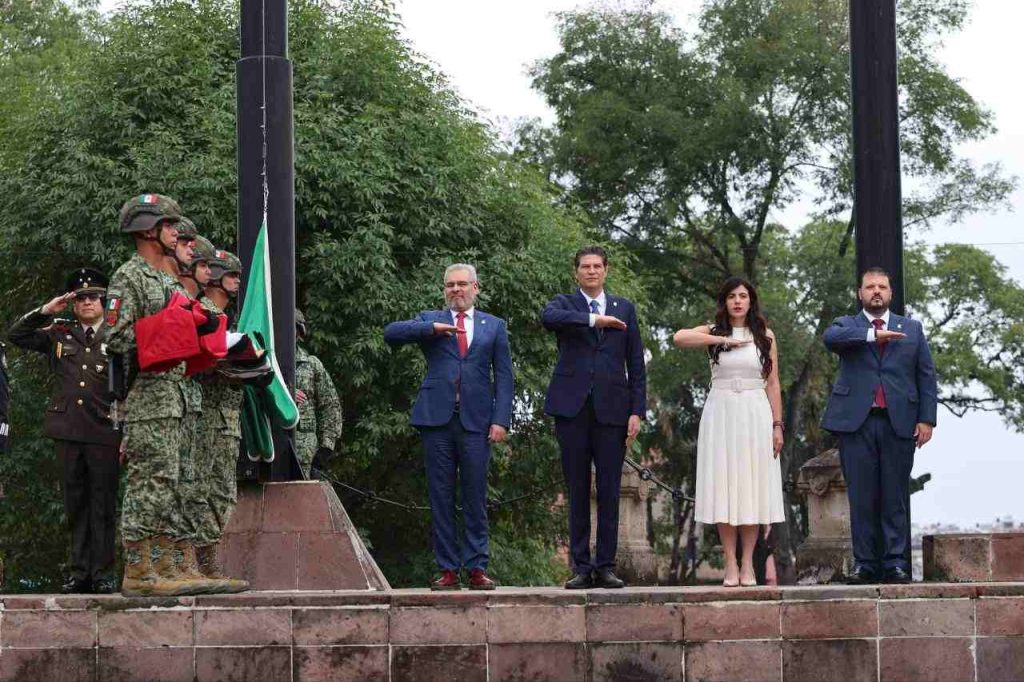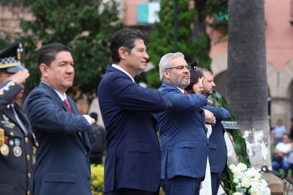 Al acto cívico en la Plaza Jardín Morelos se dieron cita: el gobernador del Estado, Alfredo Ramírez Bedolla; la diputada presidenta de la Mesa Directiva del Congreso, Giulianna Bugarini Torres; el magistrado presidente del Poder Judicial, Hugo Alberto Gama Coria.
