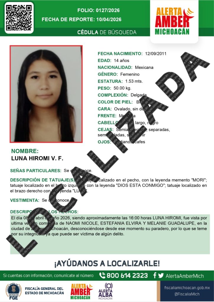 Zamora, Michoacán, a 14 de abril de 2026.- La Fiscalía General del Estado de Michoacán (FGE) informa que fueron localizadas sanas y salvas las cuatro menores que habían sido reportadas como desaparecidas en el municipio de Zamora, tras perderse comunicación con ellas desde el pasado 8 de abril, siendo reportada su desaparición ante las autoridades el día 10.