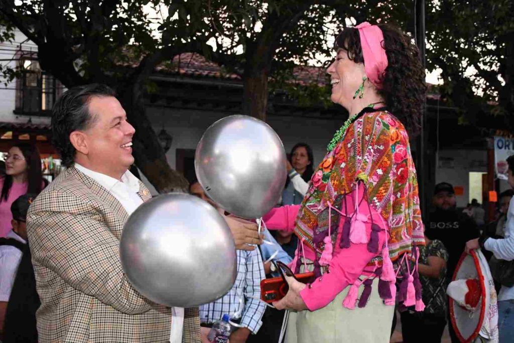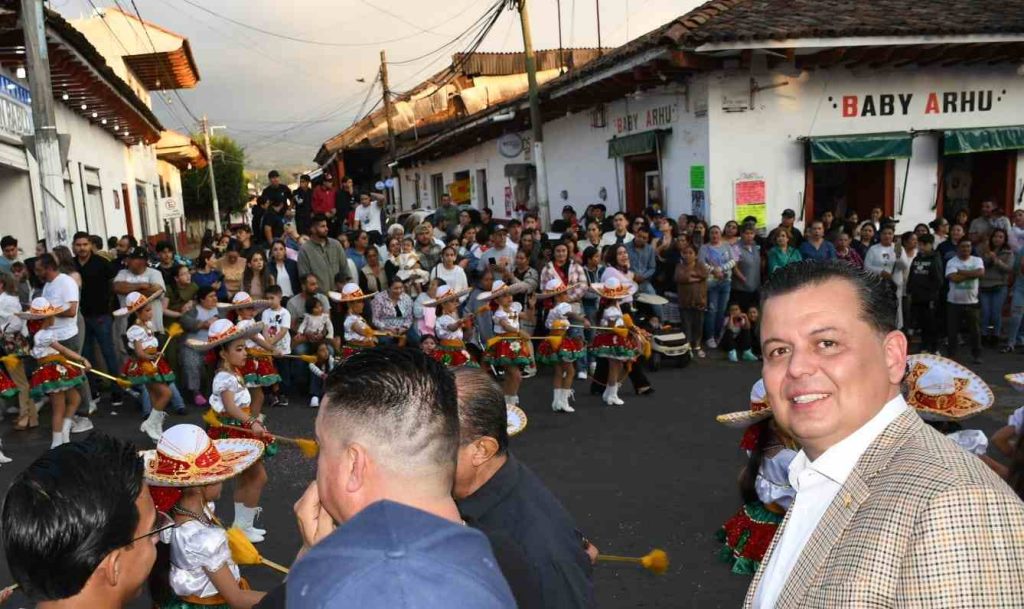 Ario, Mich., a 16 de noviembre de 2025.- Memo Valencia se convirtió en padrino de las 40 generaciones de Las Bastoneras de Ario de Rosales, que son consideradas Patrimonio Cultural Inmaterial de este municipio.