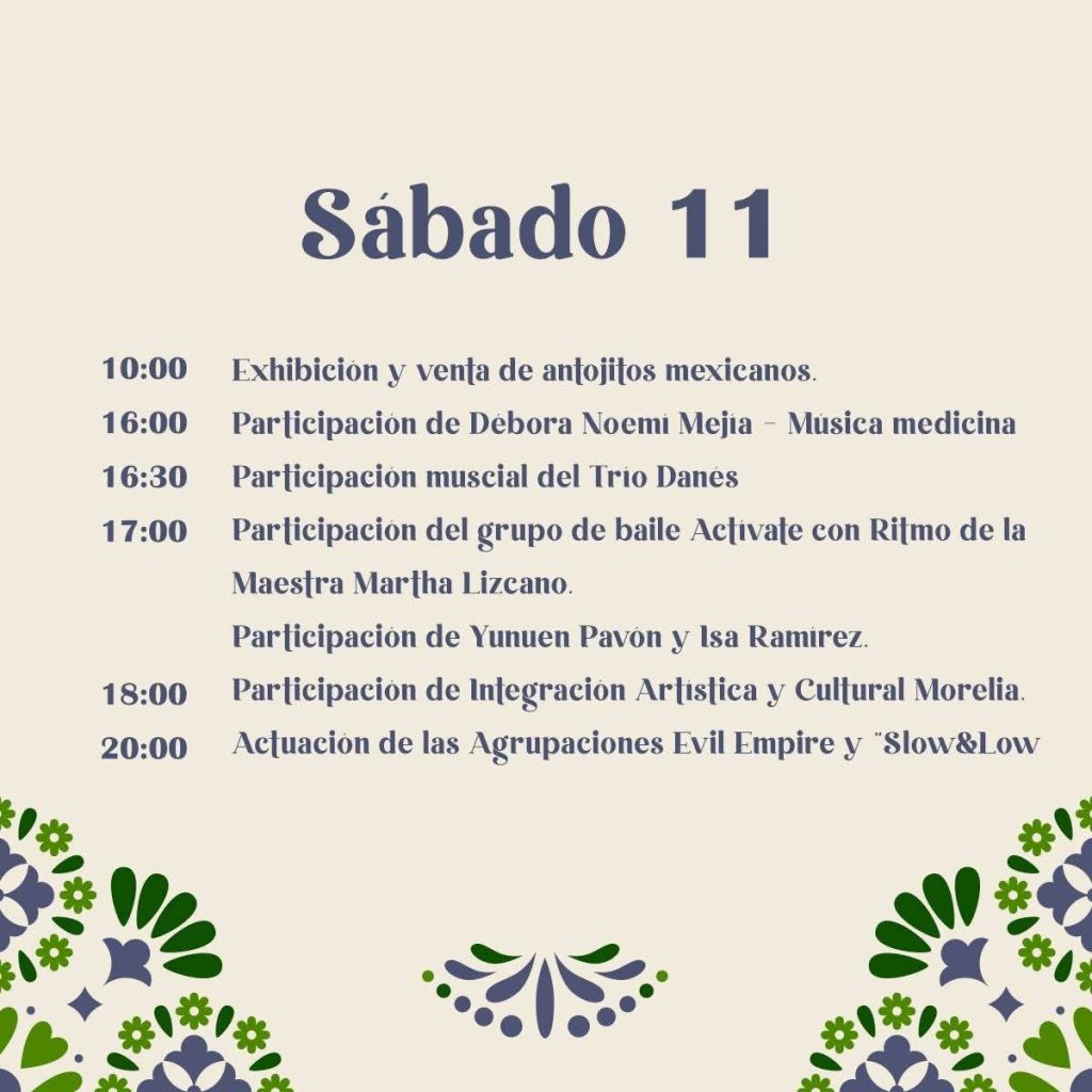 La venta de alimentos empieza a partir de las 10:00 horas, y los espectáculos artísticos se presentarán de 16:00 a 20:00 horas, en un ambiente familiar, abierto a todo público.