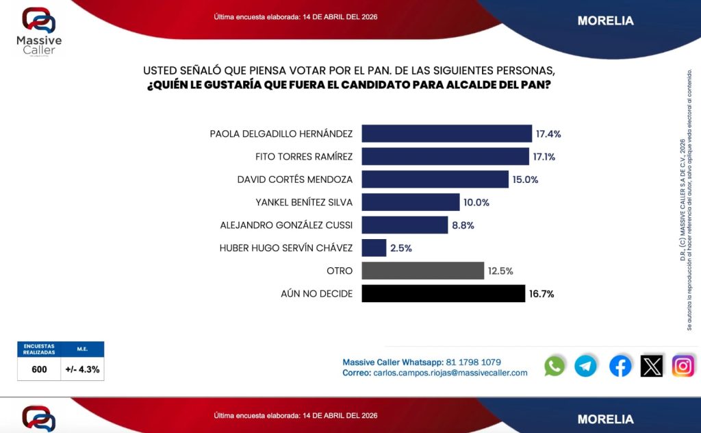 En el más reciente ejercicio de medición de la casa encuestadora Massive Caller refleja un movimiento significativo en las preferencias rumbo a la contienda por la alcaldía de Morelia, destacando el crecimiento sostenido de Adolfo “Fito” Torres.