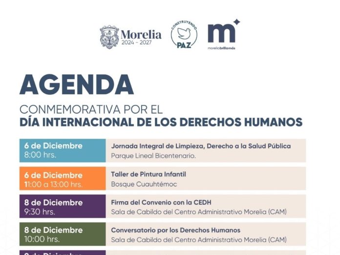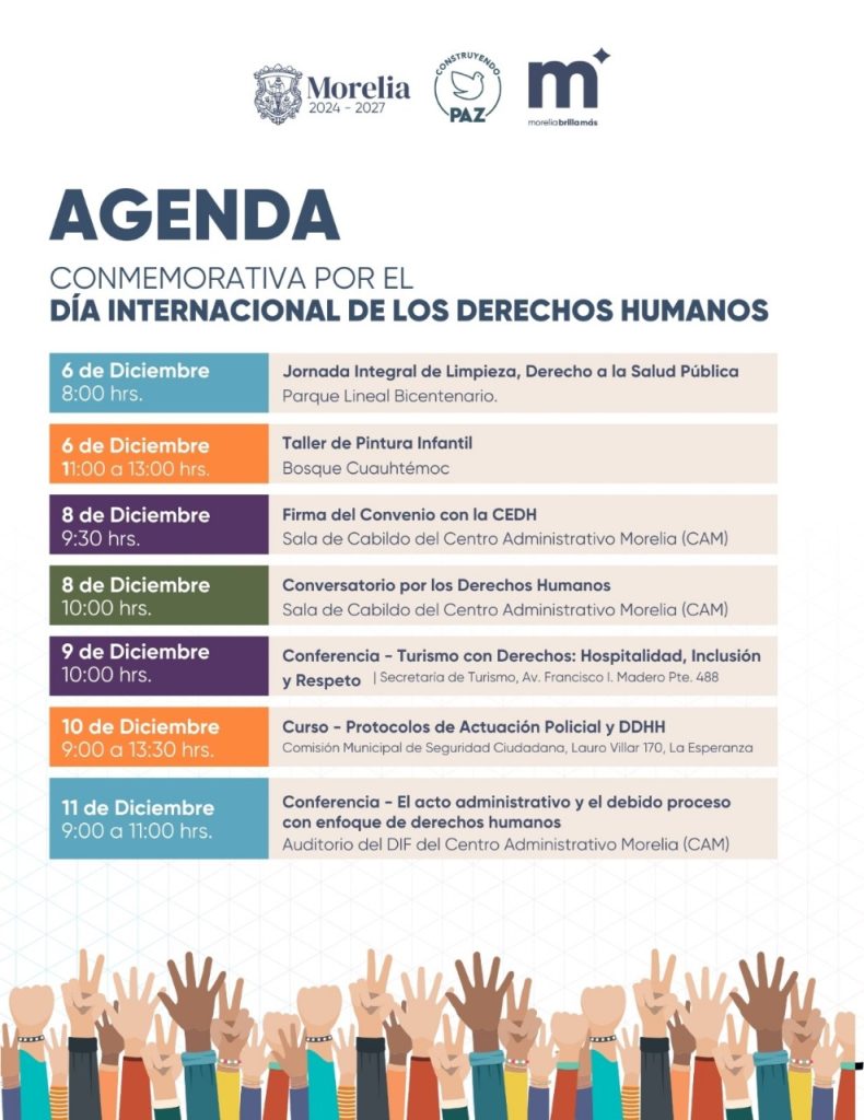 A través de esta agenda, el Gobierno de Morelia refrenda su compromiso de impulsar una ciudad más justa, segura e incluyente, donde los derechos humanos sean una guía permanente en la acción pública, por lo que se invita a la ciudadanía a participar y sumarse a estas actividades que promueven una convivencia basada en el respeto, la paz y la dignidad humana.