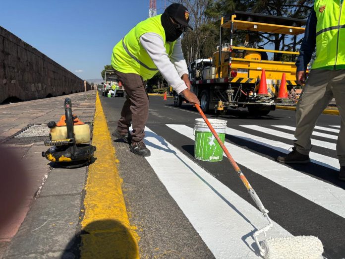 Morelia, Michoacán; 23 de marzo de 2026.– La Secretaría de Desarrollo Urbano y Movilidad (Sedum), a través del equipo de “Cebras”, inició este lunes trabajos de balizamiento integral sobre la avenida Acueducto, con el objetivo de mejorar la seguridad vial y el ordenamiento del tránsito en esta importante vialidad.