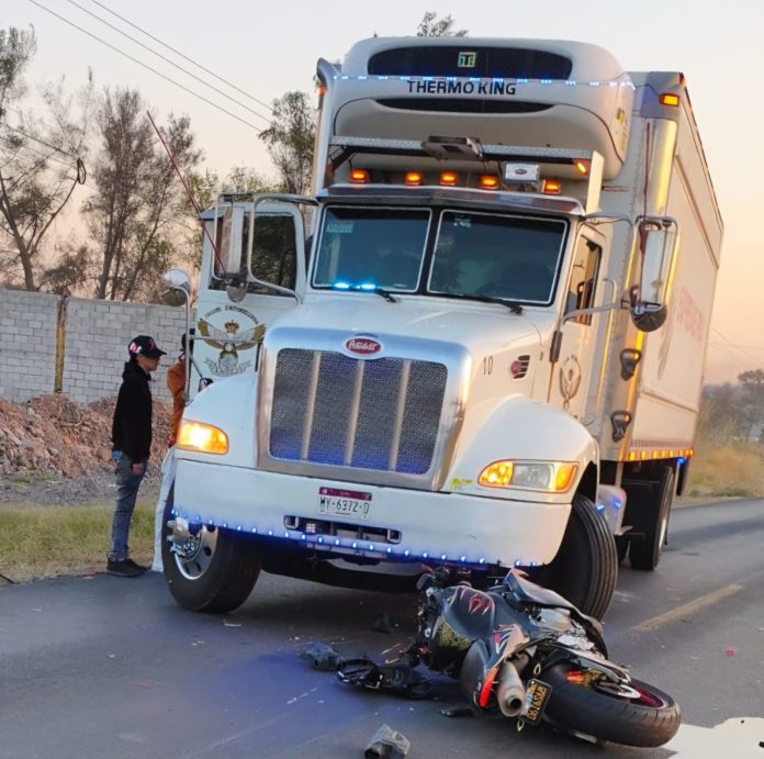 Zamora, Mich.- 16 de marzo de 2026.- Un estudiante del Tecnológico de Zamora, que presuntamente invadió el carril contrario para rebasar, resultó lesionado al chocar su motocicleta de frente contra un camión de carga, cuyo conductor fue requerido.