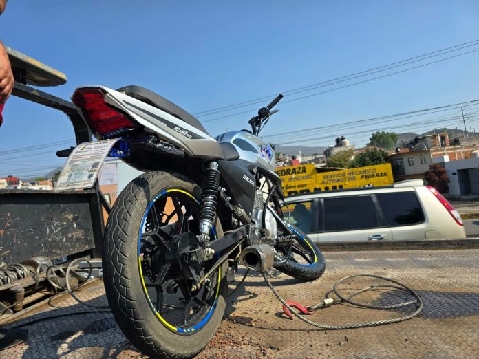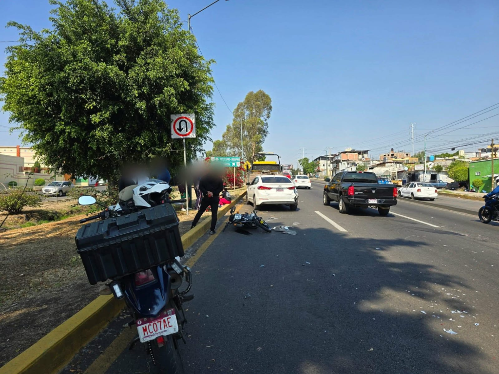 Morelia, Mich.- Martes 28 de marzo de 2026.- Un motociclista resultó lesionado tras chocar contra el costado derecho trasero de un automóvil sobre los carriles centrales del Libramiento Poniente de Morelia, informaron autoridades policiales.