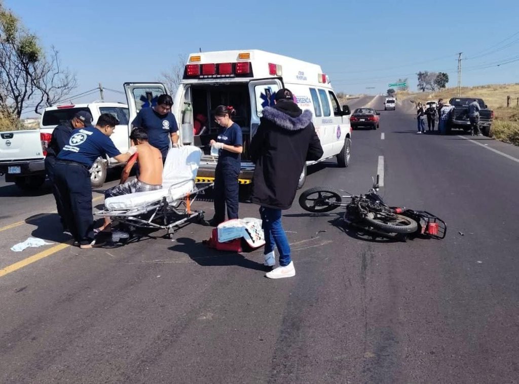 La Piedad, Mich.- 16 de Febrero del 2026.- Un joven motociclista resultó con diversas lesiones, luego de verse involucrado en un choque contra una camioneta sobre la carretera La Piedad–Numarán.