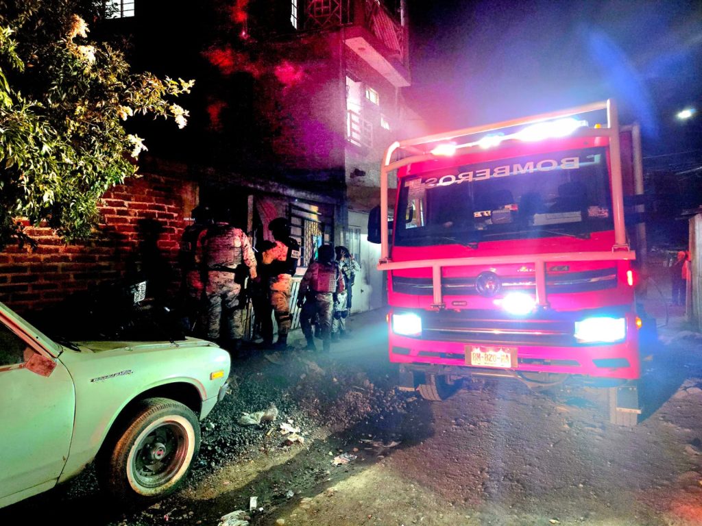 Zamora Mich.- 4 de marzo de 2026.-Un fuerte incendio se registró en una casa de la colonia Revolución de la ciudad de Zamora. Oficiales de la Guardia Nacional acudieron para otorgar apoyo y lograron poner a salvo a una familia que habitaba el inmueble siniestrado.