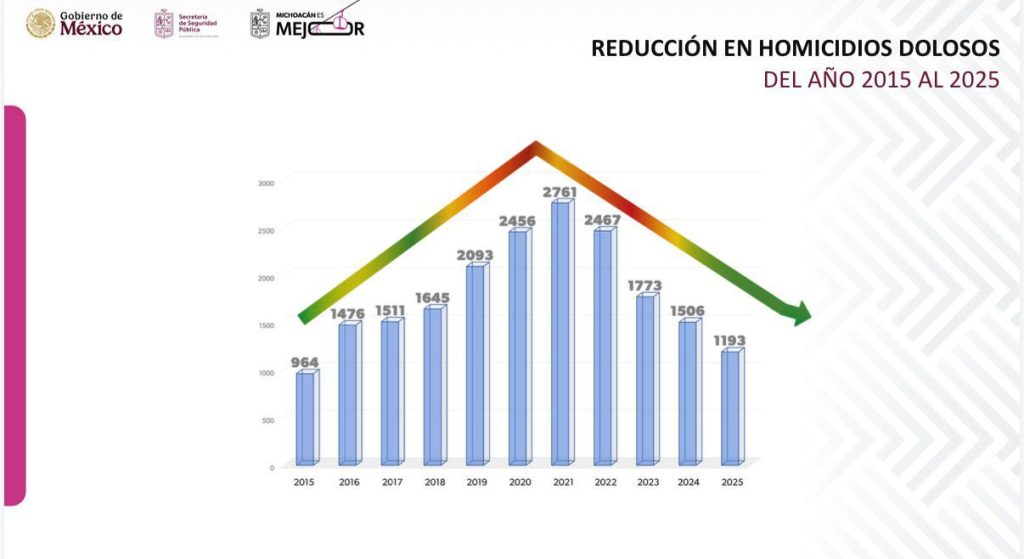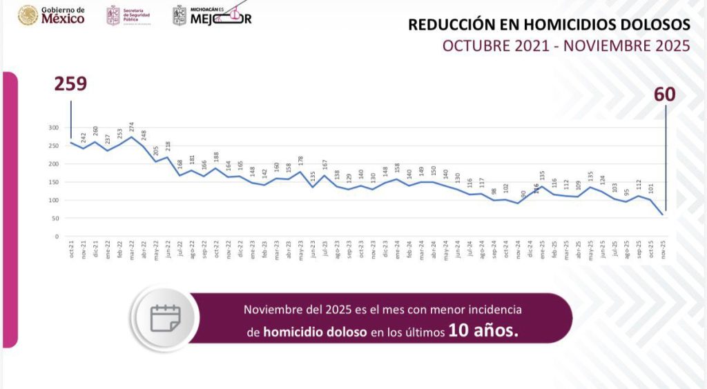 Morelia, Michoacán, 4 de diciembre de 2025.- Con 60 casos de homicidio doloso ocurridos durante el mes de noviembre, como parte del Plan Michoacán el estado registró la cifra más baja durante los últimos 10 años, así lo refirió el gobernador Alfredo Ramírez Bedolla.