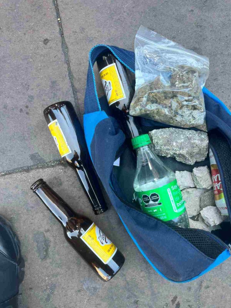 Morelia, Michoacán; 5 de noviembre de 2025.- En atención a un reporte ciudadano, oficiales de Policía Morelia interceptaron a un sujeto que se encontraba al exterior del Congreso del Estado portando piedras y envases de cristal, además de una bolsa con hierba verde con características propias de marihuana.