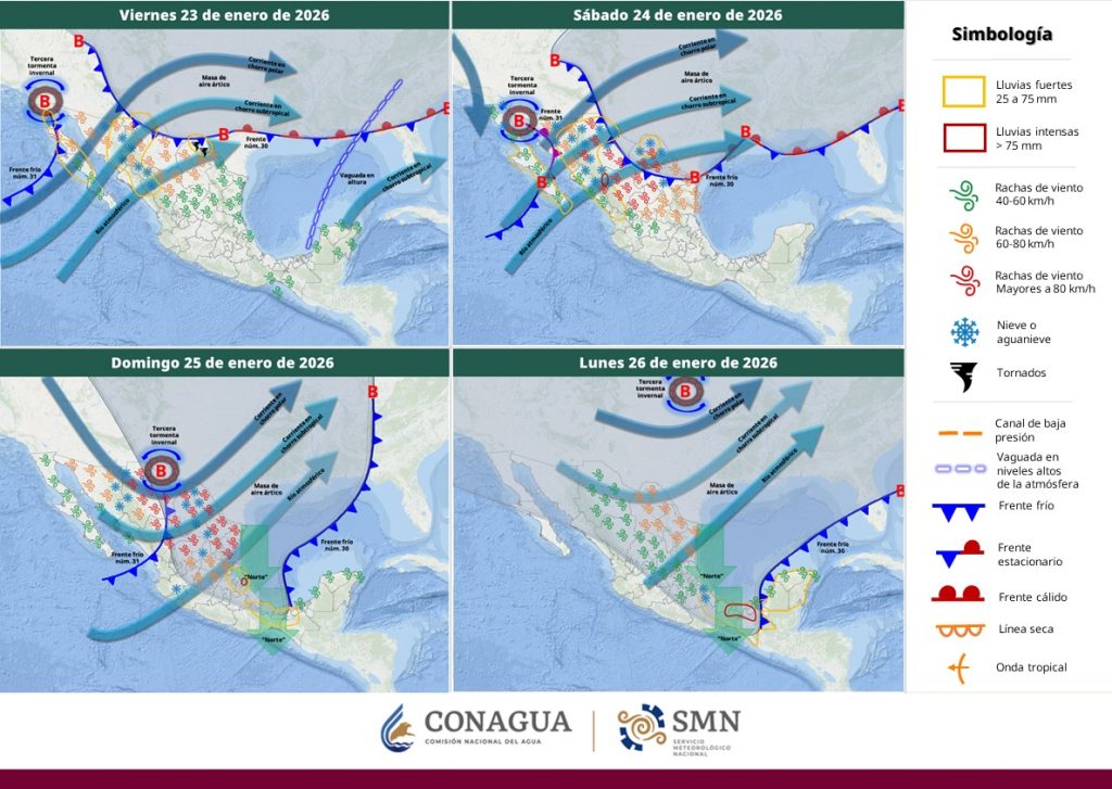 Para el domingo 25 de enero, el sistema se expandirá hacia el Golfo de México y el centro del país. Se activará un evento de “Norte” intenso con rachas de 70 a 90 km/h en Tamaulipas y Veracruz, extendiéndose al Istmo de Tehuantepec, elevando el oleaje hasta los 4 metros de altura.