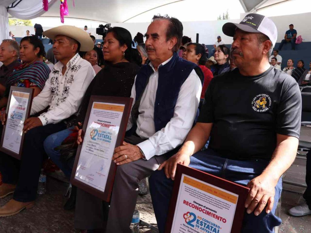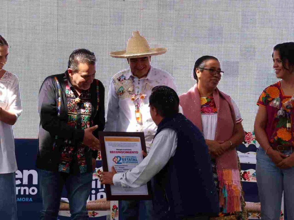 Las y los artesanos ganadores de las diferentes categorías que recibieron su premio fueron: el maestro artesano de Uruapan, Tomás Caro Romero, ganador del Galardón Zamora, con su guitarra de concierto de cedro y cobolo; la maestra artesana Ángela Perucho Amado, de la localidad de Angahuan, con un gabán en telar de cintura.