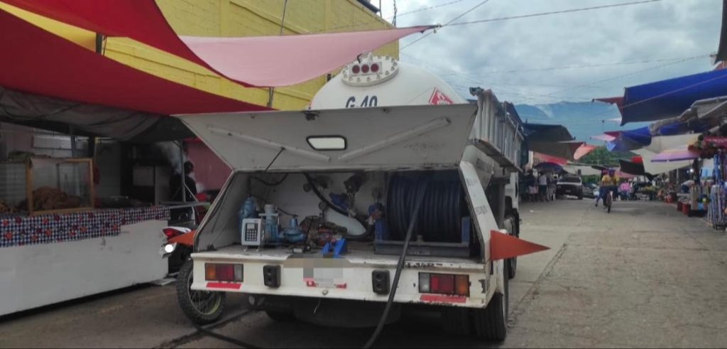 Huetamo, Mich.- Miércoles 17 de diciembre de 2025.- Una pipa de gas LP que abastecía cilindros en el Mercado Municipal de Huetamo, sin cumplir con las medidas de seguridad correspondientes, fue detectada por elementos de Protección Civil, quienes suspendieron la maniobra debido al riesgo que representaba para comerciantes y clientes del citado inmueble.
