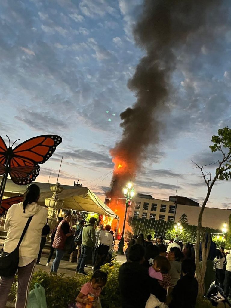 Zitácuaro, Mich.- Miércoles 10 de diciembre de 2025.- Derivado del asesinato de la joven Ángeles Esquivel, de 24 años de edad, ocurrido el pasado domingo 07 de diciembre en la colonia Infonavit y en el que está presuntamente implicado un oficial de Tránsito Municipal de Zitácuaro, un grupo de manifestantes salió a las calles de la ciudad para exigir justicia y, durante la acción, quemaron el árbol navideño ubicado en la Plaza Cívica Benito Juárez.