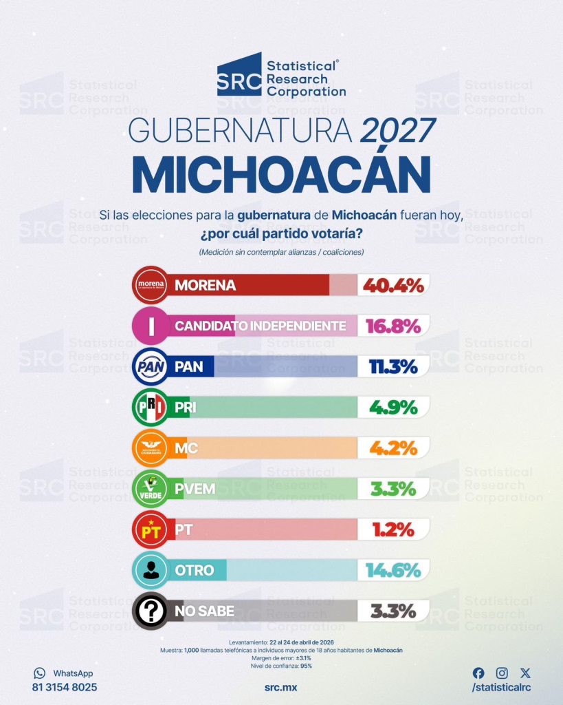 Finalmente, la encuesta de SRC midió la intención de voto por partido político, que reafirmó que MORENA es la fuerza política hegemónica en Michoacán con un 40.4% de simpatías. Muy por debajo se encuentran las candidaturas independientes (16.8%) y el PAN (11.3%), mientras que partidos como el PRI y MC no logran superar el umbral del 5%.