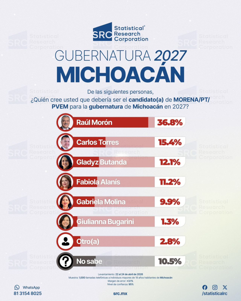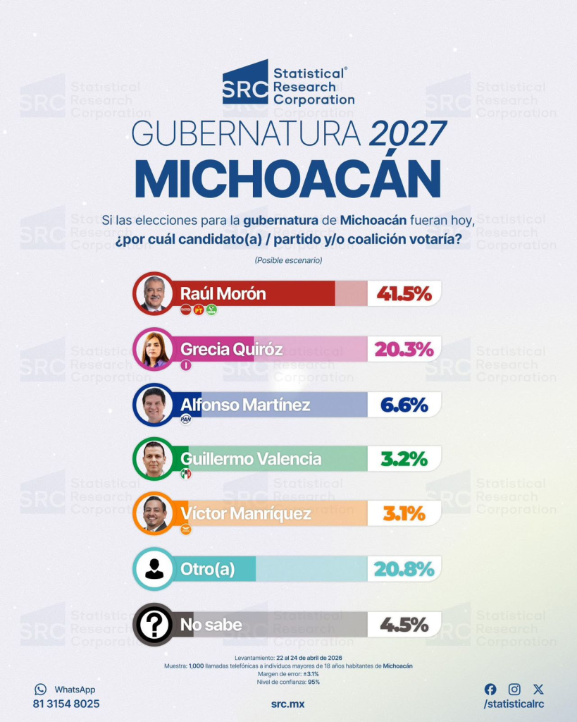 Morelia, Mich., a 28 de abril de 2026.- De cara al proceso electoral de 2027, el panorama político en Michoacán arroja un claro favorito, Raúl Morón Orozco, esto de acuerdo a los datos más recientes de la casa encuestadora Statistical Research Corporation (SRC), que lo posiciona como el perfil que supera con amplitud a cualquier adversario de la oposición y consolida la continuidad de la Cuarta Transformación en la entidad.