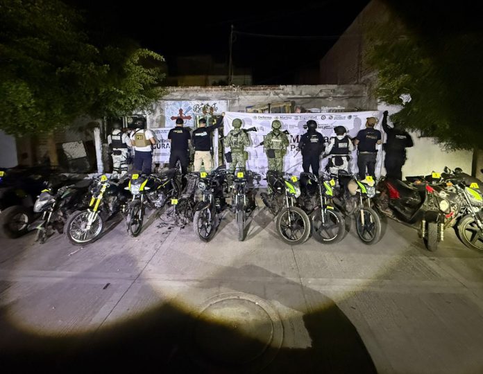 Jacona, Michoacán, 25 de diciembre de 2025.- En una acción interinstitucional, elementos de las secretarías de Seguridad Pública (SSP) y de la Defensa Nacional (Defensa), así como la Guardia Nacional (GN), dieron acompañamiento a una orden de cateo que cumplimentó la Fiscalía General del Estado (FGE) en un inmueble en Jacona, donde se recuperaron 11 motocicletas robadas.