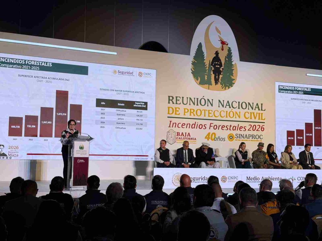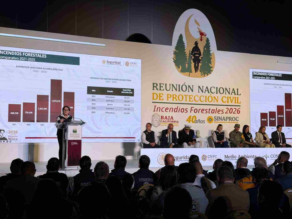 La coordinadora nacional de Protección Civil de la Secretaría de Seguridad y Protección Ciudadana, Laura Velázquez Alzúa, y la gobernadora del estado de Baja California, Marina del Pilar Ávila Olmeda, inauguraron este día la Reunión Nacional de Protección Civil de Incendios Forestales 2026.