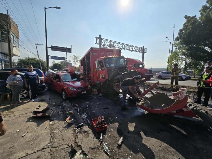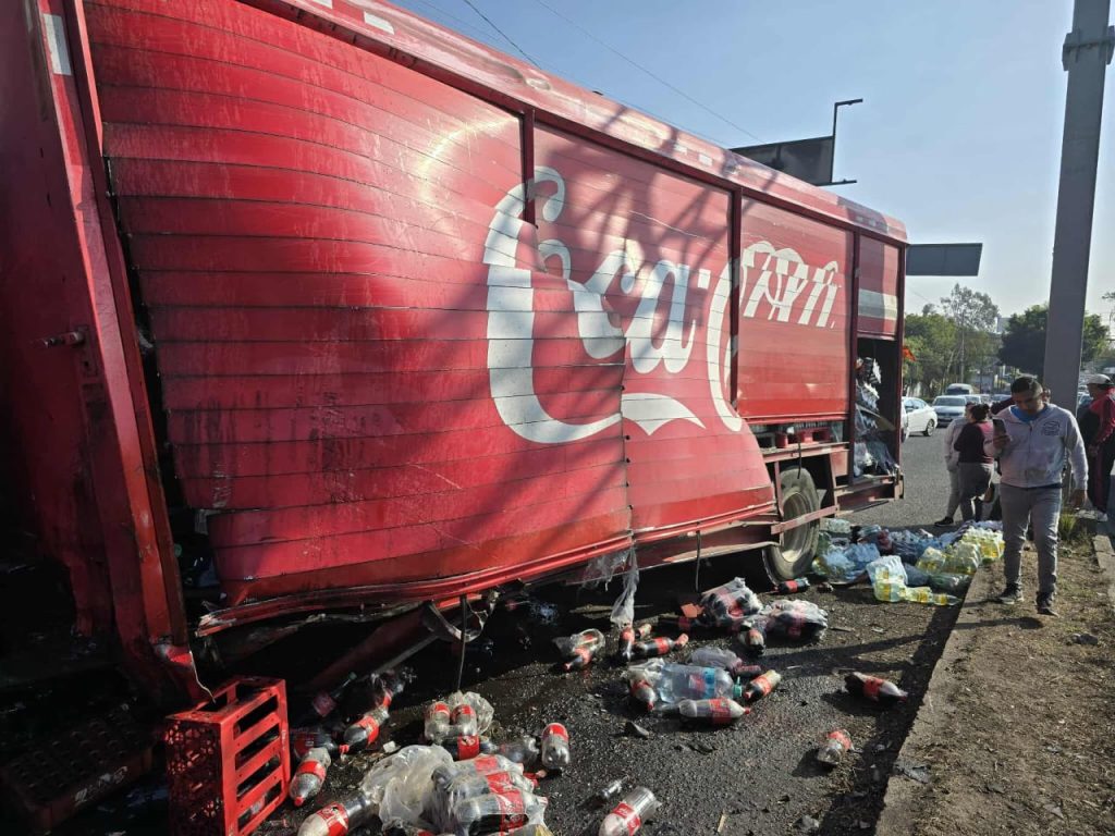 Morelia, Mich.- Miércoles 24 de diciembre de 2025.- Un camión de la empresa Coca-Cola chocó contra un poste metálico en el Periférico Paseo de la República, al norponiente de Morelia. Debido al impacto, parte de su cargamento se salió tras el movimiento brusco, cayó sobre una camioneta y, a su vez, la empujó contra otro vehículo que se encontraba estacionado a la orilla del camino, informaron autoridades policiales.