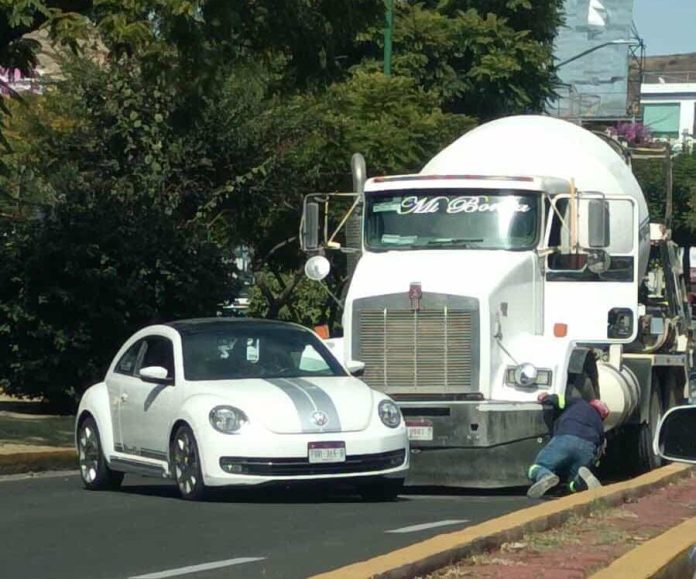 Morelia, Mich.- Jueves 13 de noviembre de 2025.- Un camión revolvedor de cemento y un automóvil compacto protagonizaron un choque sobre los carriles centrales del Libramiento Suroriente de Morelia, percance que únicamente dejó daños materiales, informaron fuentes allegadas a las autoridades policiales.