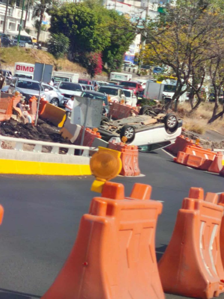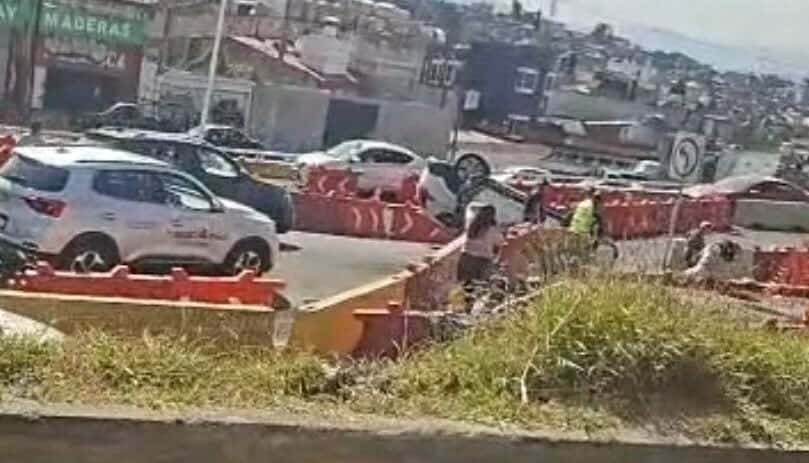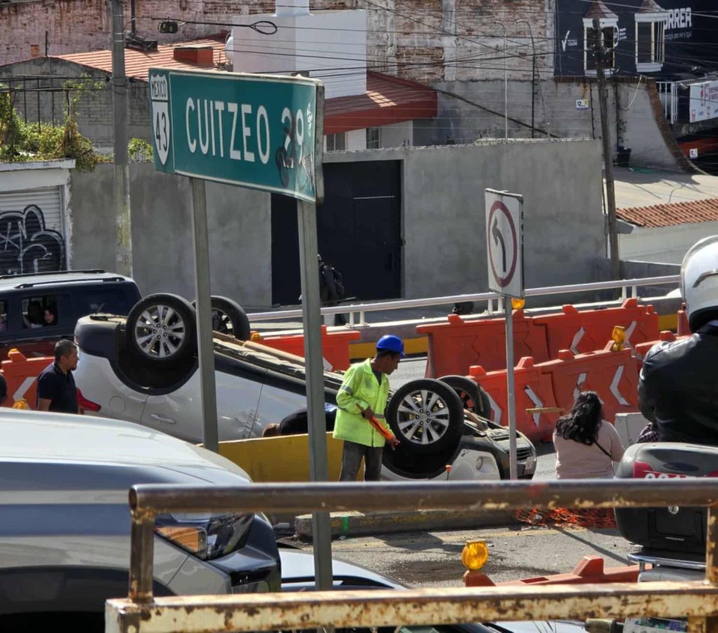 Morelia, Mich.- Martes 11 de noviembre de 2025.- Una camioneta blanca volcó sobre el Periférico Paseo de la República, en la zona oriente de Morelia, justo donde se realiza la construcción del Distribuidor Vial Eréndira, indicaron autoridades policiales.