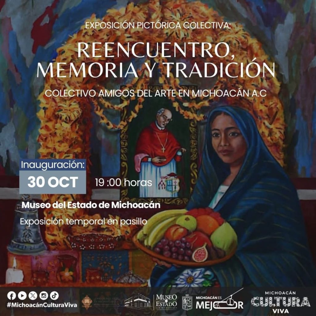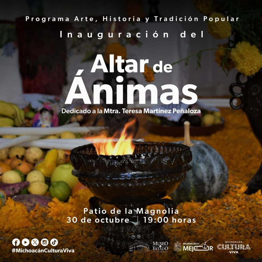 El jueves 30 de octubre se llevará a cabo una jornada dedicada al arte y la memoria. A las 15:00 horas se abrirá la exposición “Entre el rito y la penumbra. Escenas del legendario mexicano”, del artista Gabriel Alfonso; y a las 19:00 horas se inaugurará el tradicional Altar de Ánimas, dedicado a la maestra Teresa Martínez Peñaloza, como parte del programa Arte, Historia y Tradición Popular. En ese mismo horario, el colectivo Amigos del Arte en Michoacán A.C. presentará la muestra colectiva “Reencuentro, memoria y tradición”, en el pasillo del recinto.