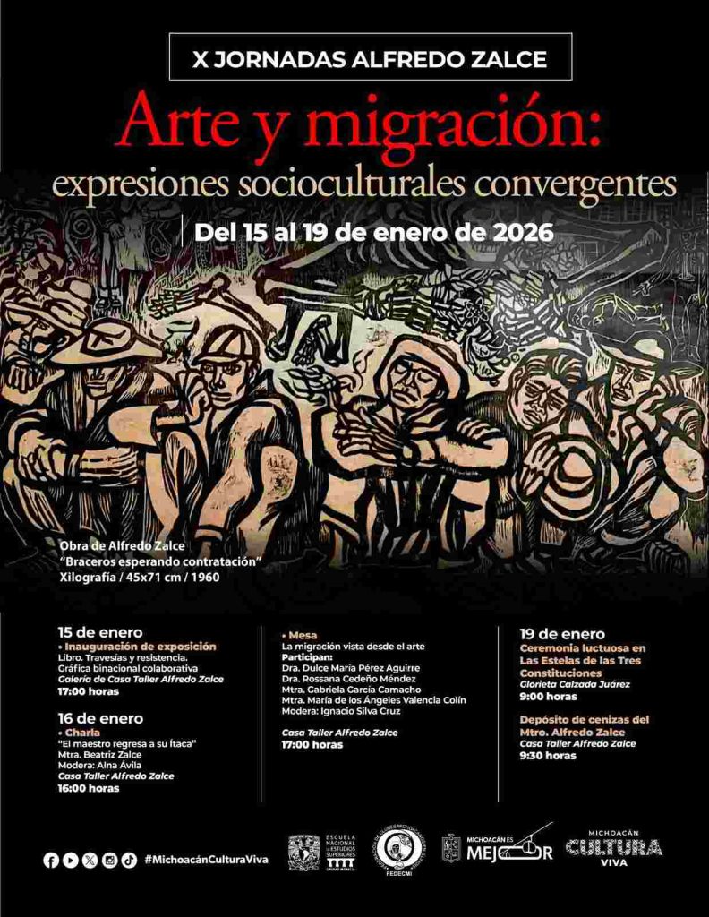 Morelia, Michoacán, 13 de enero de 2026.- Para conmemorar el 23 aniversario luctuoso de Alfredo Zalce, la Secretaría de Cultura de Michoacán (Secum) llevará a cabo las jornadas tituladas “Arte y migración: expresiones socioculturales convergentes”. El programa iniciará el 15 de enero a las 17:00 horas, en la galería de la Casa Taller Alfredo Zalce, con la inauguración de la muestra “Libro. Travesías y resistencia”, una exhibición de gráfica binacional colaborativa.