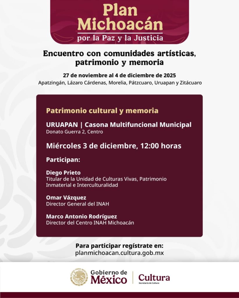 La mesa “Patrimonio cultural y memoria” se realizará en la Casona Multifuncional Municipal de Uruapan, ubicada en Donato Guerra 2, Centro, a las 12:00 horas. Participarán Diego Prieto, titular de la Unidad de Culturas Vivas, Patrimonio Inmaterial e Interculturalidad; Omar Vázquez, director general del INAH; y Marco Antonio Rodríguez, director del Centro INAH Michoacán.