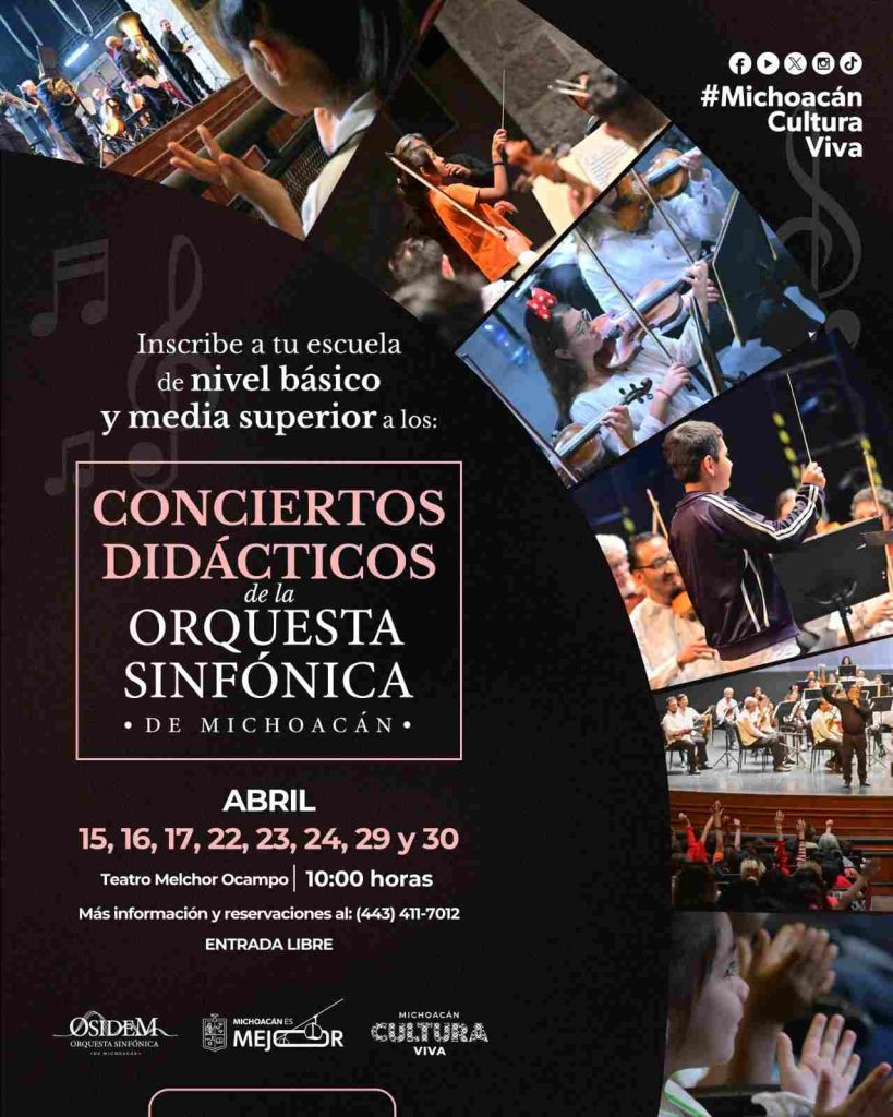 Morelia, Michoacán, 23 de febrero de 2026.- La Secretaría de Cultura de Michoacán (Secum) invita a instituciones educativas de nivel básico y medio superior a participar en los conciertos didácticos de la Primera Temporada 2026 de la Orquesta Sinfónica de Michoacán (Osidem), una propuesta formativa que acerca a niñas, niños y adolescentes a la experiencia de la música orquestal en vivo.